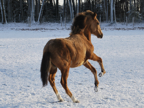 Neue Bilder von Marias Perusso. Zingaros und Perlas Sohn von 2010 genießt seinen ersten Schnee und tobt selbstbewußt über die verschneiten Weiden.